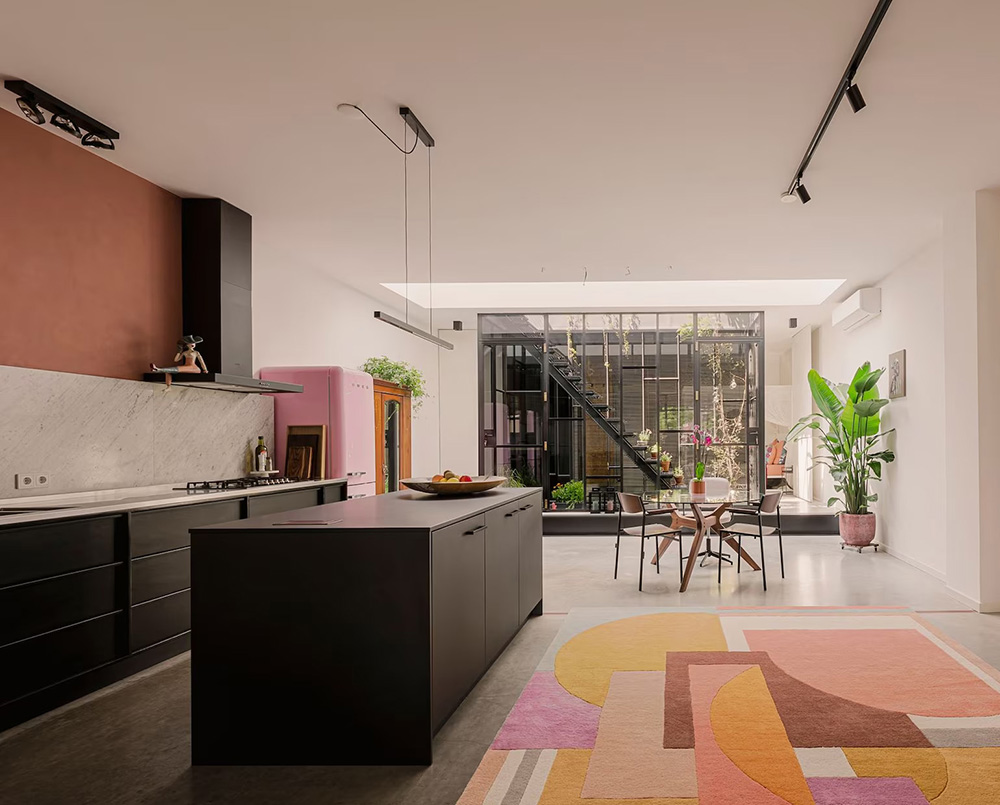 Пространство этого лофта в Амстердаме имеет неудобную удлинённую планировку и строгий холодный характер, но нидерландским дизайнерам удалось наполнить его стилем и жизнью. Так, стеклянные перегородки и эффектная минималистичная мебель удачно подчеркнули индустриальные черты этого современного жилья, в то время как красочные акценты и интересные детали декора (такие, например, как САП в гостиной) сделали интерьер ещё и запоминающимся. Ну а уникальное патио и терраса на крыше стали настоящими изюминками этого стильного жилья.