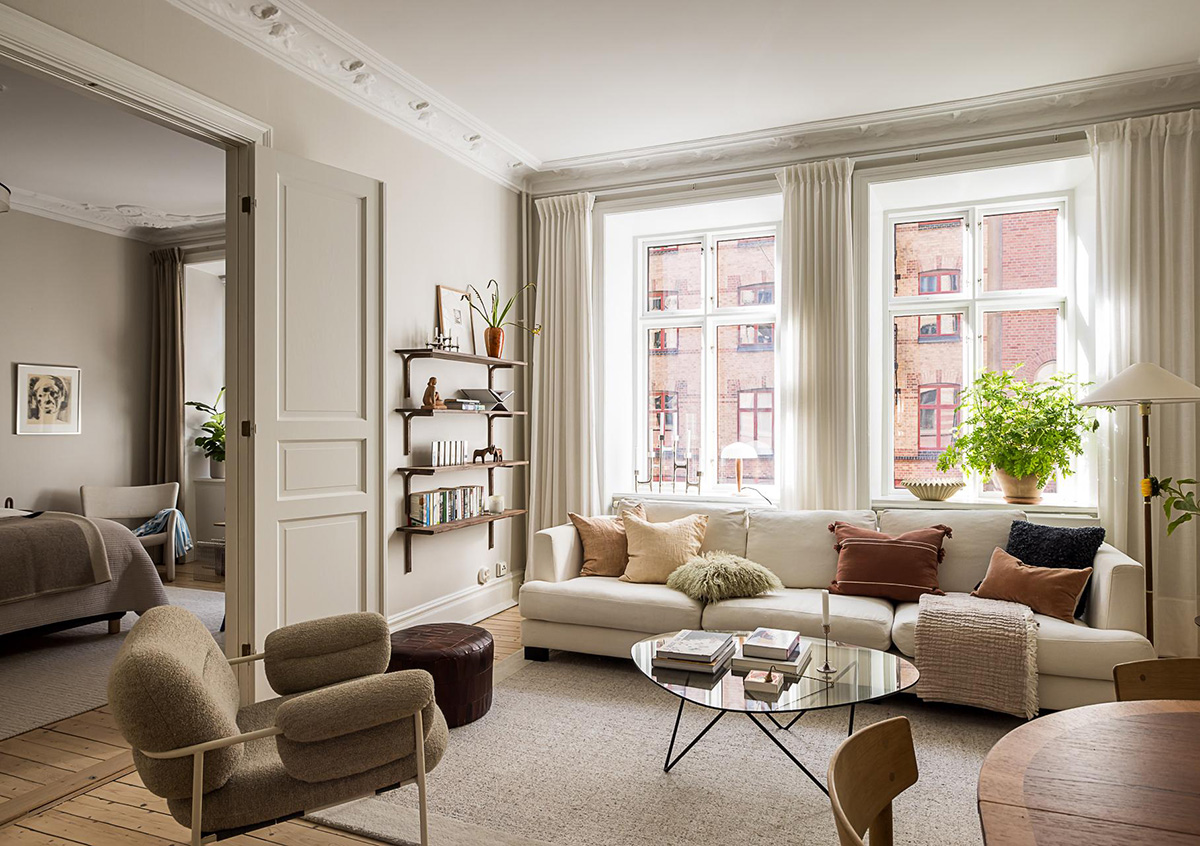 Интерьер этой шведской квартиры в бежевых тонах смотрится очень целостно и гармонично. В скандинавских интерьерах часто бывает, что одна или две комнаты «выпадают» из общей картины, но в этом случае каждый уголок получился красивым и привлекательным. Тема оттенков бежевого прослеживается в оформлении каждой комнаты, а элегантные детали вне времени не только подчеркивают великолепие пространств с лепниной, но и стилистически объединяют все интерьеры квартиры. Уютно и со вкусом!