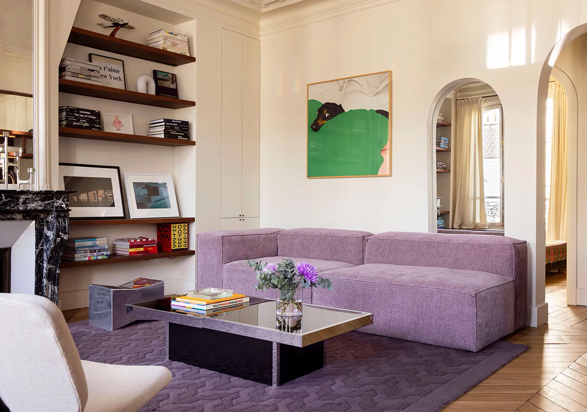 Светлый фон, красочные детали и немножко творчества — эта небольшая квартира в Париже оставляет очень приятное впечатление. Лиловый диван и ковёр такого де цвета в гостиной сразу настраивают на жизнерадостный лад, в то время как красивый натуральный камень в отделке кухни и камина придают интерьеру элегантности. Ну и какой же парижский интерьер без предметов искусства — книги на открытых полках, фотографии в рамках и современные картины делают этот дом живым и уникальным.