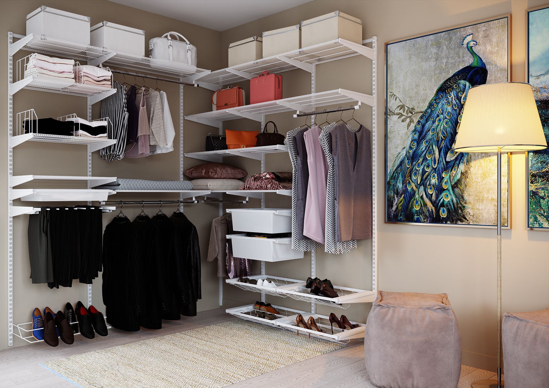 - Продумайте систему хранения. Разделите пространство на зоны для разных типов одежды и аксессуаров.