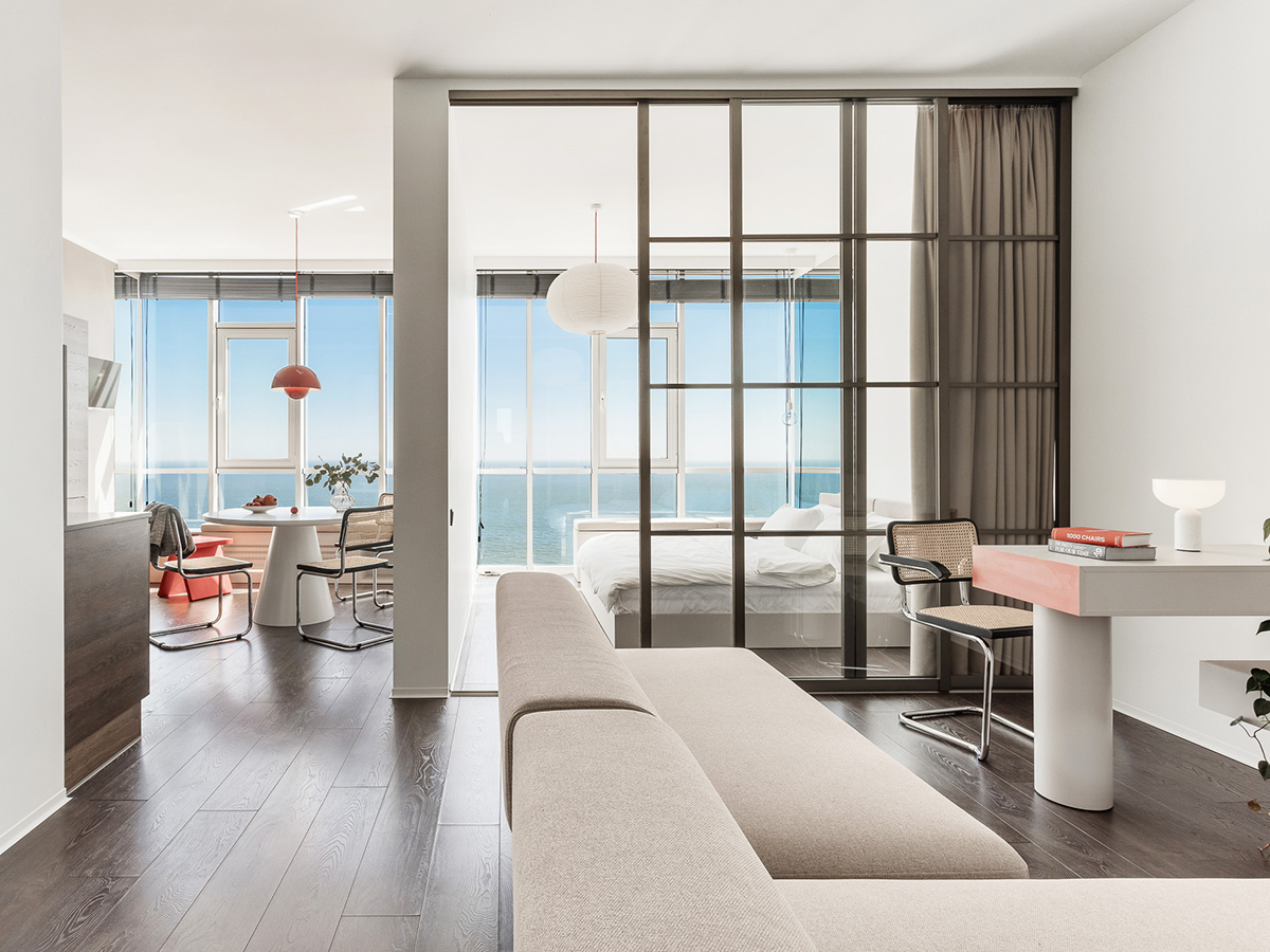 Наслаждаться морем с высоты 23 этажа в стильной минималистичной обстановке — эта арендная квартира-студия в одной из высоток Одессы предлагает особый опыт для желающих отдохнуть на побережье. Дом находится почти у самой воды, поэтому в интерьерах не покидает ощущение, что ты паришь над морем. Квартира оформлена в светлых тонах с лёгкими цветными вставками современного декора, таким образом всё внимание сконцентрировано на бирюзу за окном и бесконечный горизонт. Enjoy!
