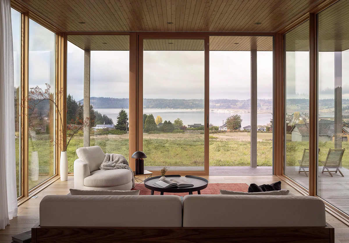 Уютное убежище для отдыха и медитации — этот современный домик на острове Уидби, штат Вашингтон, был создан для того, чтобы семья хозяев могла время от времени сбегать от всех и проводить время наедине с природой. Дом является собой серию одноэтажных прямоугольных блоков со стеклянными и деревянными стенами, связанных между собой коридорными переходам. Он построен на небольших сваях, поэтому кажется, будто строение парит над лугом. А ещё здесь есть целая комната для медитаций. Идеальное местечко для уединения!