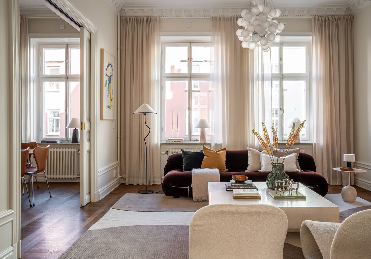 Изысканный современный дизайн в приятной светлой и тёплой цветовой гамме — интерьер этой великолепной классической квартиры в центре Стокгольме получил прекрасное обновление. Современная мебель и утончённые декор наполнили стилем и актуальностью красивые пространства квартиры, а нежные натуральные оттенки добавили лёгких игривых ноток в атмосферу. Этот интерьер прекрасен в каждой детали — от паркета ёлочкой и классической ленины до предметов современного искусства на стенах и зеркала в необычной «колючей» раме. Enjoy!