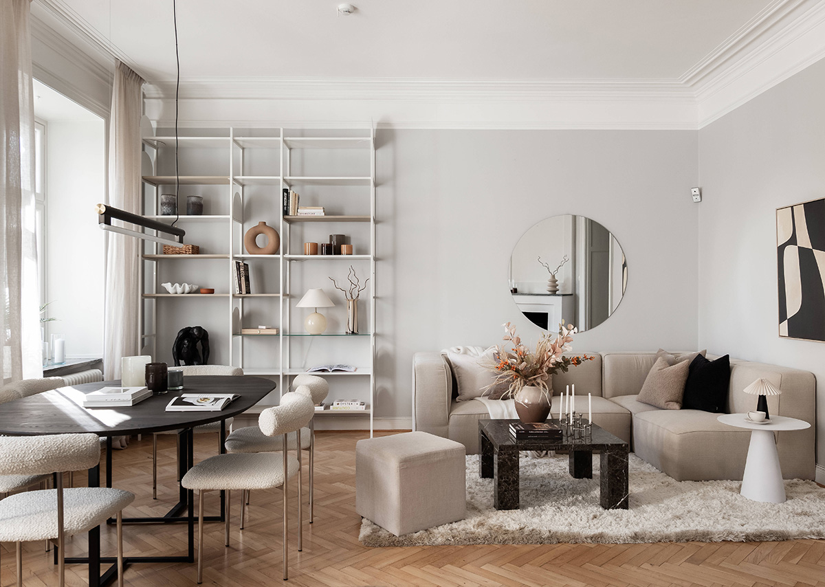 Несмотря на то, что эта квартира находится в 100-летнем доме в Стокгольме, дизайнерам удалось объединить кухню и гостиную в одно прекрасное открытое общее пространство с тремя огромными окнами и морем естественного света. Эта комната ещё и имеет нежную пастельную цветовую гамму и настоящий камин — интерьер получился очень мягким и уютным. Интересно, что жильё расположилось на первом этаже рядом со старинной готической церковью, которая виднеется из окон. Enjoy!