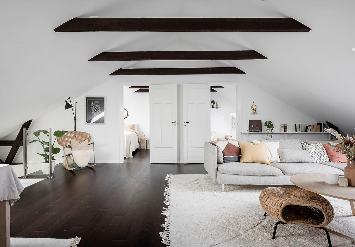 Эта скандинавская квартира занимает последних два этажа невысокого старого дома в одном из исторических районов Гетеборга. Её нижний уровень не представляет собой чего-то сверхинтересного или необычного — это привычный нам приятный скандинавский интерьер в тёплых пастельных тонах. Зато верхний этаж (тот, который под крышей) впечатляет. Это красивой и светлое пространство со скошенными потолками, балками и открытой планировкой с атмосферой загородного жилья. Enjoy!