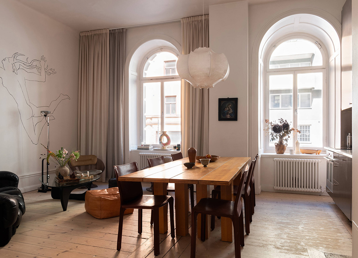 Роскошное пространство с высокими потолками и арочными окнами — эффектная, но не единственная фишка этой квартиры в Стокгольме. Интерьер наполнен лёгкими и интересными творческими нотками, которые выделяют его на фоне типичных скандинавских квартир. Одна только роспись на стене в гостиной чего стоит! В мебели и декоре также мало знакомого и стандартного — дизайнеры постарались подобрать оригинальные предметы без привязки к определённому стилю или направлению. Смелым получился интерьер спальни с её грубой индустриальной стеной за кроватью. Enjoy!