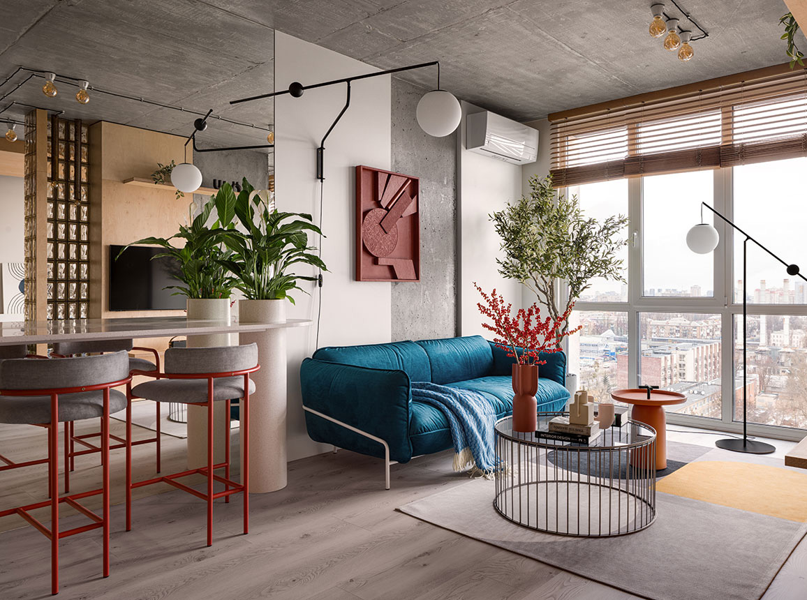 Украинская студия DIHOME наполнила современную квартиру с бетонными перекрытиями оригинальными яркими деталями и акцентами в духе авангардного искусства начала прошлого века. Главным вдохновением для дизайна стало творчество известного художника родом из Киева Казимира Малевича, основателя такого течения как супрематизм. Отсюда геометрические формы и сочные краски в декоре. И это при общей площади всего 42 кв. м!