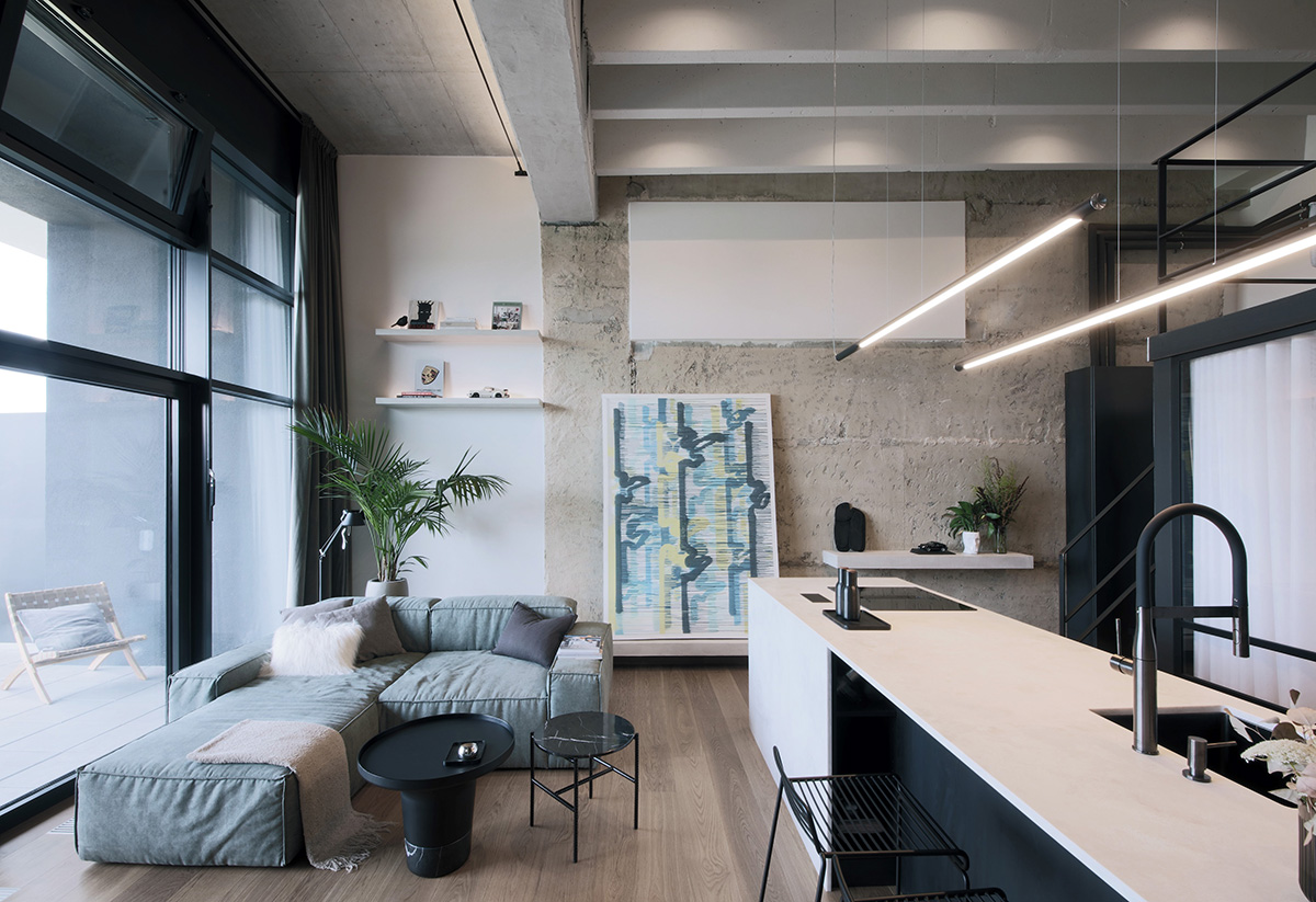 А вот это уже индустриальный дизайн в своём чистом виде. Бетон, мебель в тёмных тонах, высокие потолки и лаконичная современная мебель — эта квартира в одном из новых домов в Праге соответствует практически всем критериям жилья в индустриальном стиле. Так как жильё имеет небольшую площадь, дизайнеры использовали всю высоту стен — спальня разместилась на антресольном этаже. Ну а бонусом — прекрасный балкон-терраса с видом на прекрасный город!