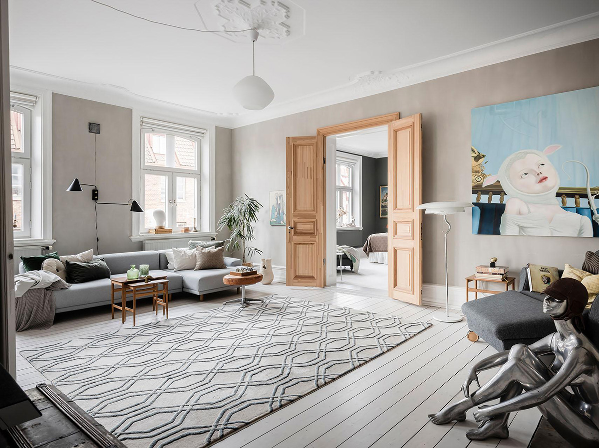 Эта шведская квартира впечатляет своими контрастами. И первый из них — это прекрасная двустворчатая дверь из гостиной в спальню из натурального дерева в деревенском стиле, которая является главным акцентом в интерьере. Также довольно смелым был выбор цвета стен в комнатах — от голубой обеденной до тёмно-серой спальни. Кроме этого, судя по настенному декора, хозяева увлекаются современным искусством и его самых экстравагантных проявлениях. И это мы ещё не говорили об просторном угловом балконе с прекрасными видами!