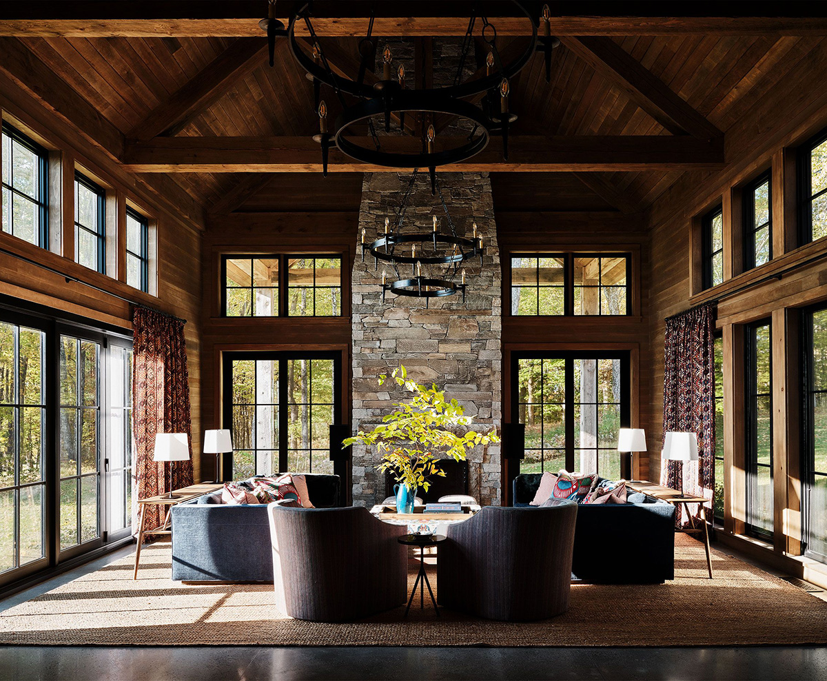 Этот дом в Вермонте расположен на вершине горы, но он совсем не похож на типичный горный домик или шале. Во-первых, местность — он разместился на зелёной лужайке почти без деревьев поблизости, зато виды отсюда открываются просто восхитительные. Во-вторых, дизайн — здесь мы видим смесь горного стиля с его грубыми деревянными поверхностями и традиционного американского дизайна с цветочными обоями и классической мебелью. Получилось довольно оригинально и уютно!