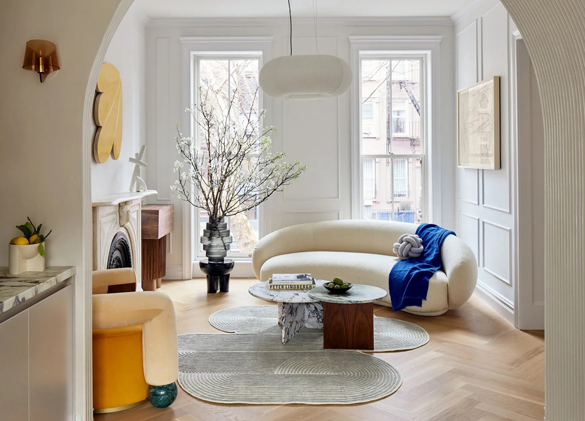 Архитектор Alexandra Barker предложила довольно необычный, но яркий и стильный вариант реконструкции старого таунхауса из красного кирпича в Нью-Йорке. Дизайн его интерьеров строится на изогнутых линиях: арочные проёмы, скруглённые углы, органические формы. Не забыл автор проекта и про историческое наследие — молдинги, камины и элегантное оформление окон гармонично вписано в современный контекст интерьеров. Отличная работа!