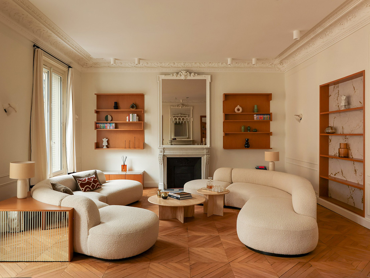 Эти прекрасные апартаменты в Париже воплотили в себе всё великолепие османовской архитектуры и лучшие современные веяния в дизайне. Лепнина, элегантный камин, окна в пол, паркет елочкой — все любимые элементы парижских интерьеров здесь присутствуют, делая пространства вдохновляющими даже без декора. С другой стороны, мы видим мягкую монохромную гамму, мебель со скруглёнными углами и утончённый современный декор, которые удачно подчеркивают элегантные линии интерьеров. Красота!