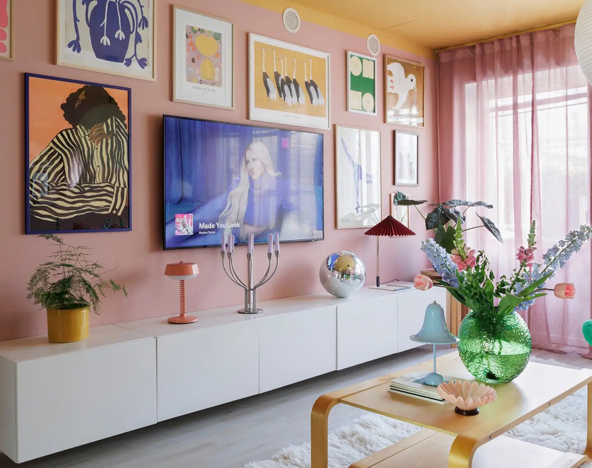 Загородный дом Софии снаружи выглядит ну уж очень скучно и неприметно. Это не красивый деревянный домик в традиционном стиле, которыми славится шведская провинция, и даже не современный коттедж со стеклянным стенами. Зато интерьеры нивелируют всю простоту и пресность фасада — в оформлении внутренних пространств хозяйка решила дать волю чувствам и красками. Розовый, желтый, голубой, и это не считая многочисленных постеров на стенах — каждая поверхность в этом доме (включая потолки) покрашена в какой-нибудь яркий или интересный оттенок. А почему бы и нет!