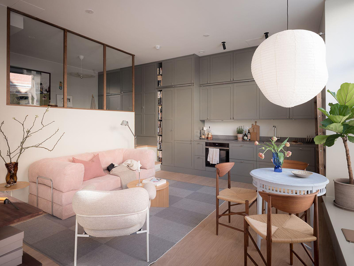 Сегодня у нас ещё один пример симпатичного скандинавского жилья на первом этаже, где раньше располагались коммерческие помещения. Недостатки жизни на первом этаже здесь с лихвой нивелируются интересным открытым пространством с высокими потолками и большими окнами, современной планировкой и стильный декором из пастельных оттенков. Спальное место здесь виртуозно отделено от общего интерьера с помощью полустеклянной перегородки. Отличный дизайн маленького пространства!
