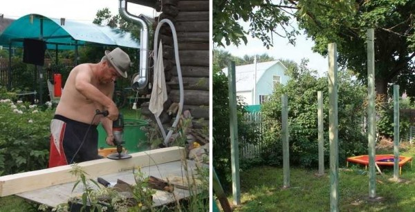 Привезенный брус 100*100 мм доводим до гладкости. Можно рубанком, можно — дрелью с закрепленной шкуркой. Сначала крупным зерном, потом — мелким. После обрабатываем от гниения защитным составом, красим. Пока столбы сохнут, бурим ямки (диаметр у нас 23 см, глубина 60 см). В них засыпаем на дно около лопаты щебня. Ставим столбы, выставляем вертикально, засыпаем щебнем, уплотняем, бетонируем.