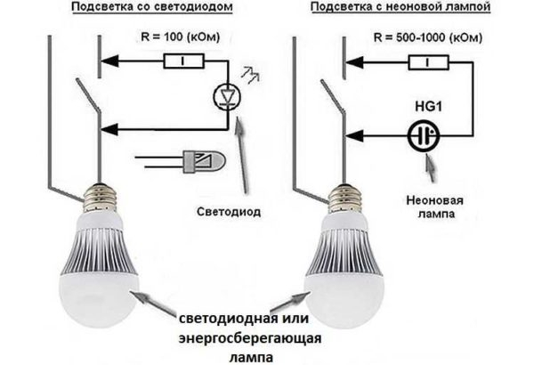 Иногда — при некоторых выключателях — лампы не мигают, а горят вполнакала. Это происходит потому, что сопротивление, которое стоит в цепи питания подсветки, мало. В результате тока хватает на поддержание небольшого заряда конденсатора. Потому и получается, что лампы горят при выключенном свете. Чаще этим страдают ЛЕД лампы (светодиодные). Методы борьбы с этим явлением такие же, как и с морганием.