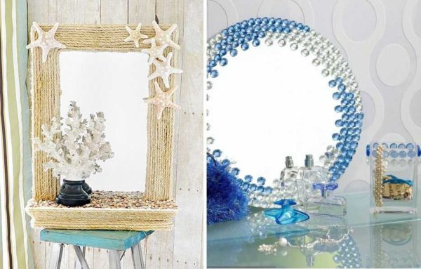 Декор зеркала своими руками делают используя самые различные материалы, в том числе те, которые обычно отправляются в мусорный контейнер, а если покупаются, то стоят совсем немного. Например, трубочки из старых газет или журналов. В некоторых случаях их используют без окрашивания, в других красят. Удобнее краска в виде спрея — наносится ровным тонким слоем, окрашивание происходит в разы быстрее, чем при использовании кисти. Еще можно использовать битую фарфоровую посуду, зеркало, цветное стекло, ракушки, камешки, стразы, стеклянные капли, пуговицы, веревки, пластиковые бутылки, ветки, деревянные планки и палочки, пластиковые ложки и другие странные вещи.