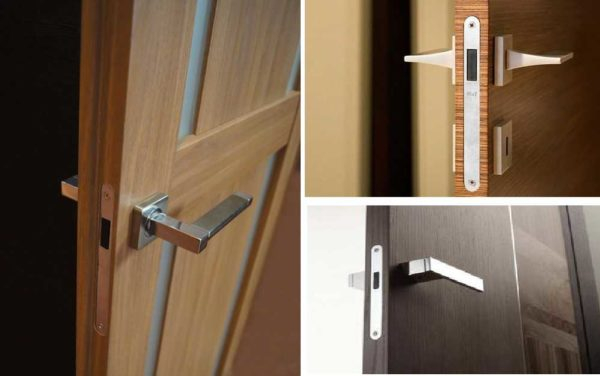 Вариант просто с ручкой — для тех случаев, когда запирать комнату нет необходимости. Ручка нужна только для открытия — чтобы увести ригель от магнита. За нее же тянут когда открывают или закрывают дверное полотно. Она может быть круглой или продолговатой, обычной и не совсем формы.