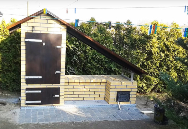 Представляют собой крупные сооружения из металла или кирпича, поэтому такие варианты больше подходят для частных домов или дач. Могут совмещать сразу несколько способов готовки продуктов: барбекю, гриль и холодное копчение.