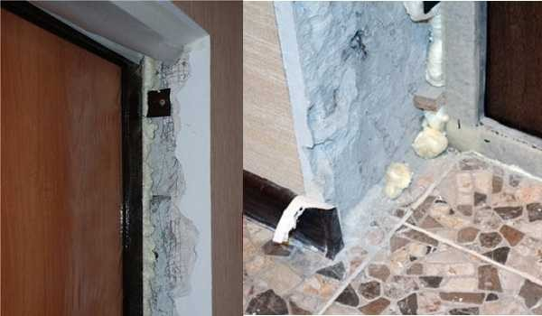 Время, необходимое на затвердение пены, зависит от температуры и влажности воздуха, но в среднем составляет 8-12 часов (для некоторых видов могут потребоваться сутки). Излишки затвердевшей пены срезают ножом, штукатурку, которая плохо держится, удаляют, сметают пыль и грязь. Можно начинать работы по отделке дверных проемов.