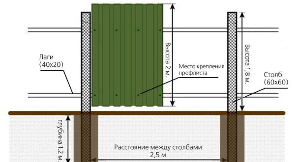 Один из наиболее недорогих заборов для дачи или частного дома — из профнастила. Конструкция у него несложная — вкопанные столбы, к которым прикреплены поперечные лаги. К этой решетке