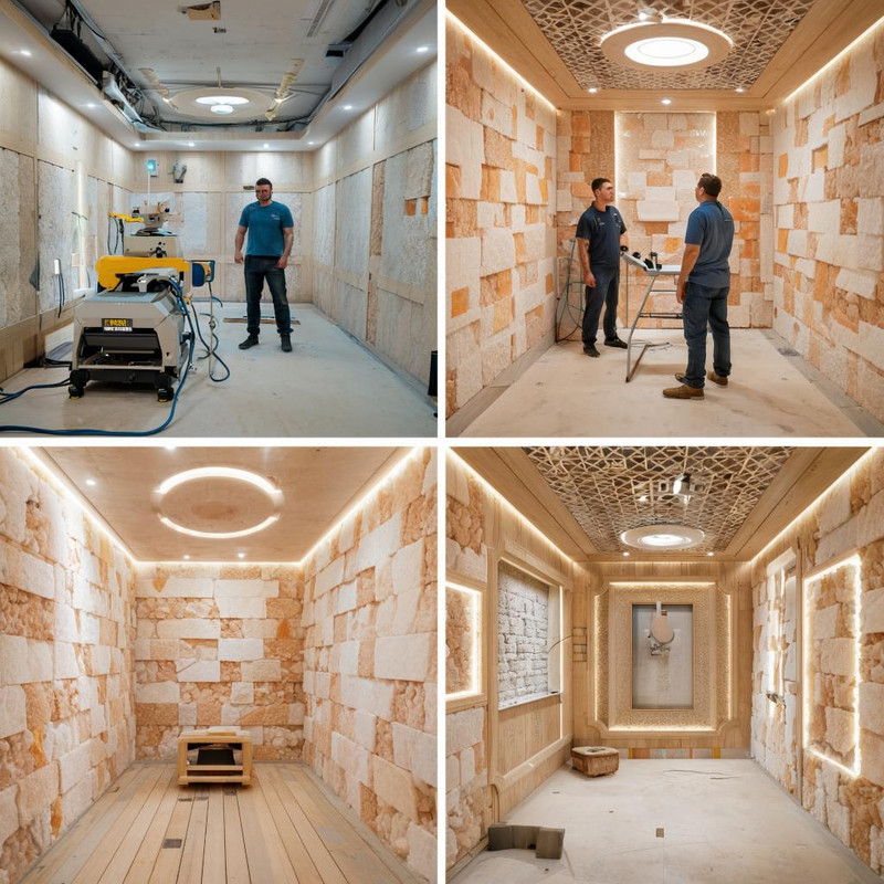 - Сертификация и безопасность: Все материалы — соль, соляные блоки, панели — должны быть сертифицированы, безопасны для здоровья и не накапливать влагу. Особенно важно выбирать соль из проверенных источников (например, гималайская или морская соль), с подтверждённым составом и отсутствием вредных примесей.