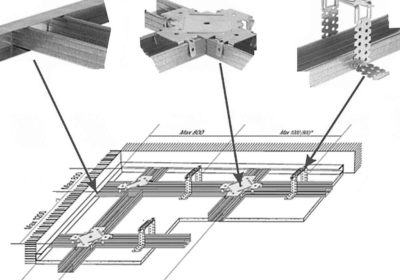 На поперечном профиле через шестьдесят см делаются отметки и устанавливаются крестообразные соединители. После этого отрезки профиля длиной шестьдесят см вставляются в соединители и крепятся саморезами к перемычкам. Затем проводятся электрические кабели и все коммуникации, проходящие под гипсокартоном. Для подвески большой люстры необходима установка дополнительных крепежных профилей. Тогда вес люстры не приведет к повреждению гипсокартона.