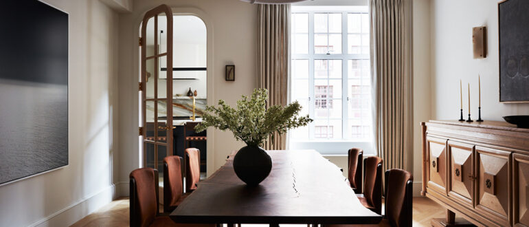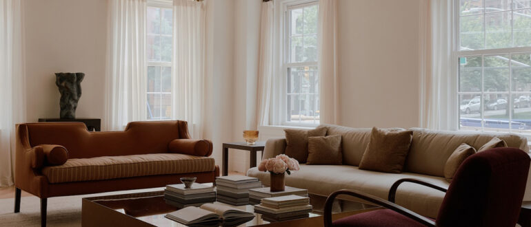 И хотя интерьеры этого таунхауса в Нью-Йорке выполнены в лаконичном современном ключе, великолепие довоенной архитектуры дома всё ещё чувствуется в объемах и некоторых декоративных деталях. Дом принадлежит молодой