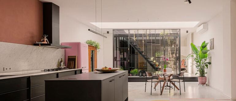 Пространство этого лофта в Амстердаме имеет неудобную удлинённую планировку и строгий холодный характер, но нидерландским дизайнерам удалось наполнить его стилем и жизнью. Так, стеклянные перегородки и эффектная минималистичная