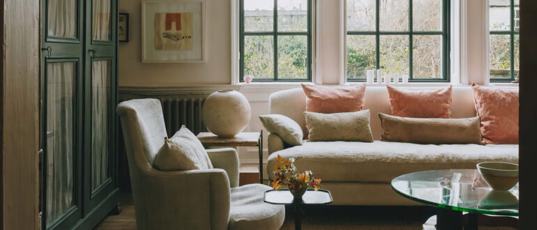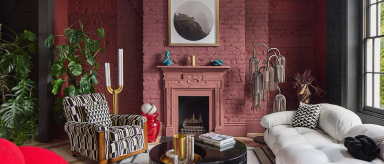 Эффектная гостиная этого таунхауса в Лондоне со смелыми терракотовыми стенами и стеклянной перегородкой по характеру очень напоминает современные скандинавские интерьеры. Но роскошное викторианское окно со ставнями и элегантный