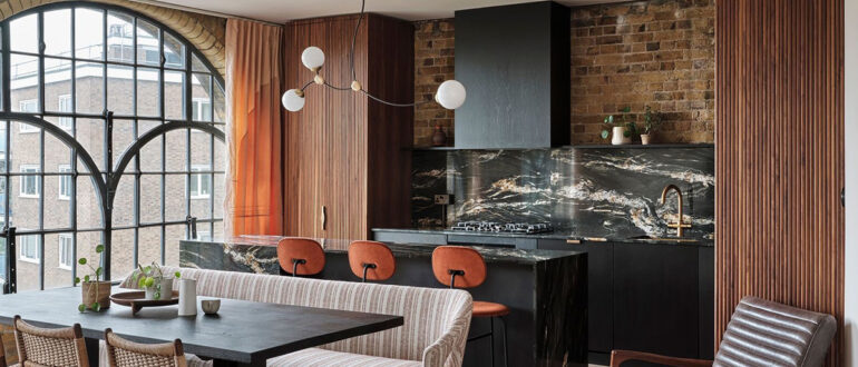 Два роскошных арочных окна делают открытую гостиную этой небольшой лофт-квартиры в Лондоне очень эффектной. Раньше в этом здании располагался склад, о чём напоминают также и кирпичные стены в