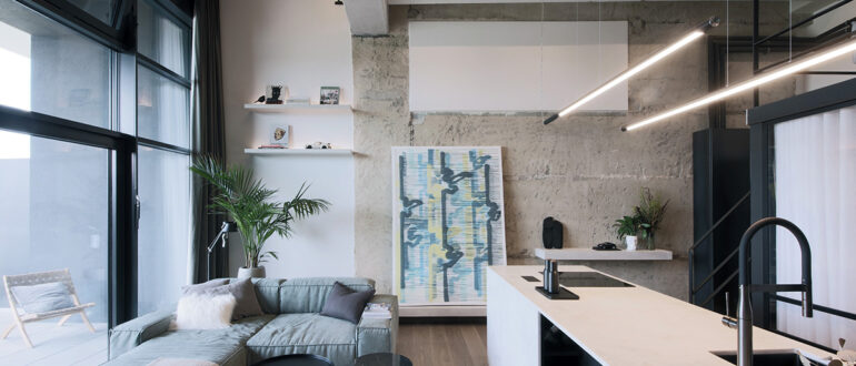 А вот это уже индустриальный дизайн в своём чистом виде. Бетон, мебель в тёмных тонах, высокие потолки и лаконичная современная мебель — эта квартира в одном из новых