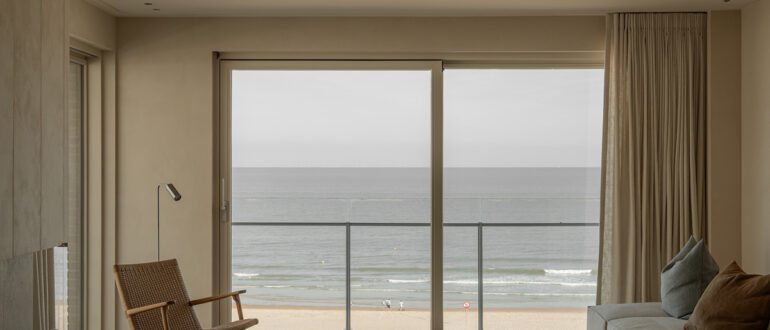 Минималистичный дизайн в спокойной монохромной гамме со сглаженными углами этой квартиры на побережье Северного моря в Бельгии — не только отголосок суровых пляжных пейзажей за окном, но и