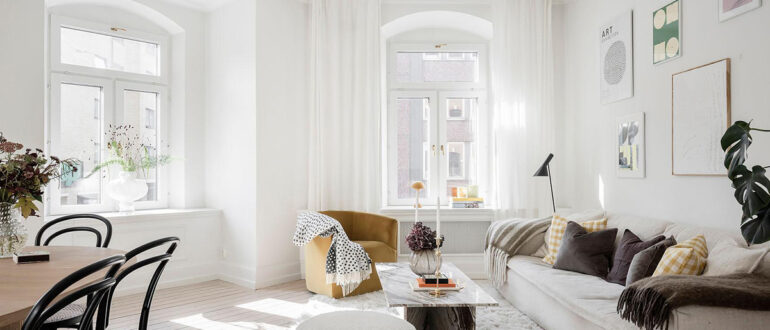 Почти все поверхности в этой небольшой двухкомнатной квартире площадью 31 кв. м в Стокгольме белые: пол, стены, потолки, кухонные шкафчики, плитка в ванной. Развеселить и оживить интерьер были