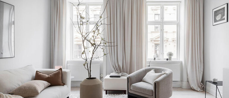 В этом скандинавском интерьере много белого цвета: диван с подушками, ковёр, шторы, корпусная мебель и не только. Стены в комнатах имеют лёгкий, еле заметный пастельно-серый оттенок, который также