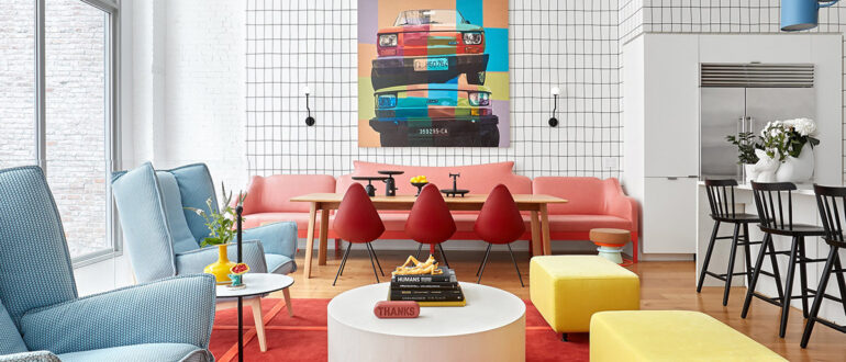 Этот лофт в Нью-Йорке — невероятный микс атмосферы бутик-отеля и впечатляющего индустриального интерьера. Вместо покраски на стенах этих апартаментов мы видим геометрические и другие яркие обои, постеры, экзотическую