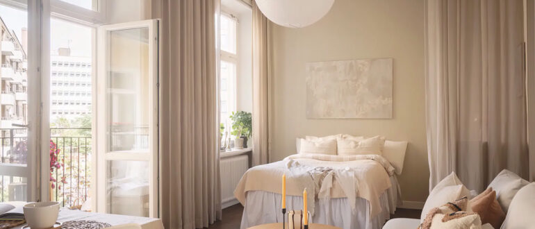 Сегодня у нас очень маленькая шведская квартира, которая выглядит на мягкое и уютное гнёздышко. Обилие текстиля (шторы, ковер, подушки и пледы), а также монохромная молочная гамма делают пространство