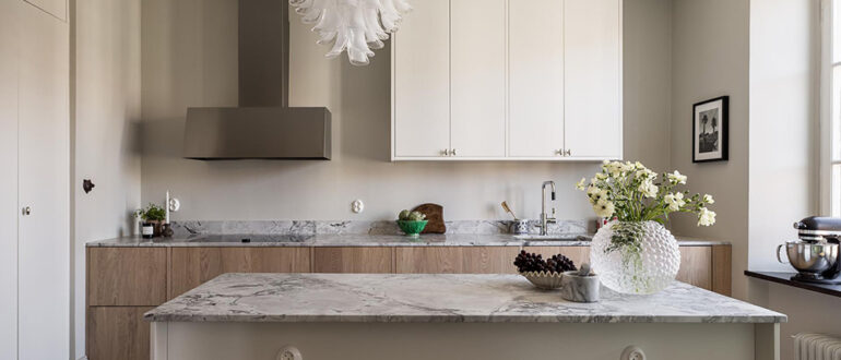 У этой шведской квартиры очень красивая современная кухня. Оригинальные деревянные фасады прекрасно сочетаются с каменной столешницей бежевого оттенка и стеклянными шкафчиками, интерьер также имеет отличное количество дневного света