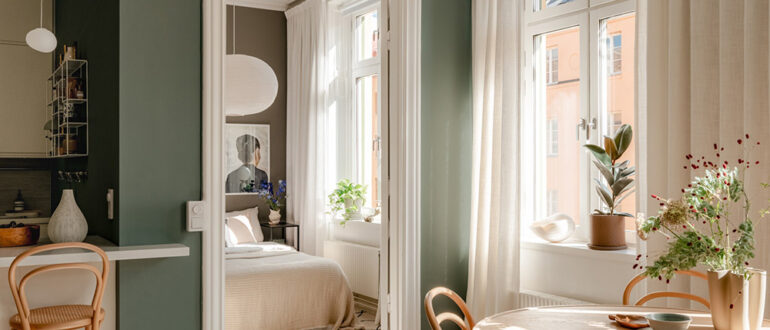 В этой небольшой шведской двушке нет белых или светлых стен. Да, есть белые акценты — в декоре и деталях, но для стен дизайнеры выбрали прекрасные глубокие тона и
