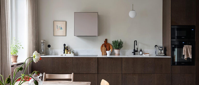 Каждый уголок этой шведской квартиры получился по-своему интересным. Кухня, например, выполнена в стильном минимализме с открытыми полками и оригинальными шкафчиками из темного дерева. В гостиной есть замечательный цветовой
