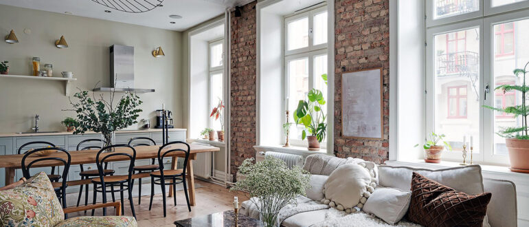 В этой шведской квартире всего два небольших фрагмента оригинальной кирпичной стены, которые дизайнеры решили оставить открытыми, но насколько же они преобразили интерьер и сделали его намного более интересным!