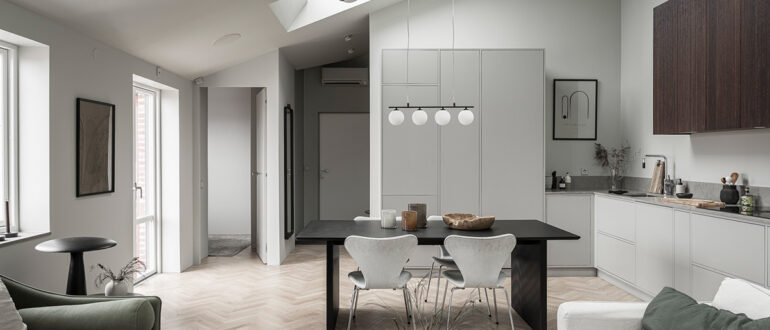 Секрет привлекательности этой небольшой современной мансардной квартиры в Гетеборге состоит из нескольких моментов. Во-первых, это интересное пространство со скошенными потолками и большим балконом, который летом превращается в дополнительную