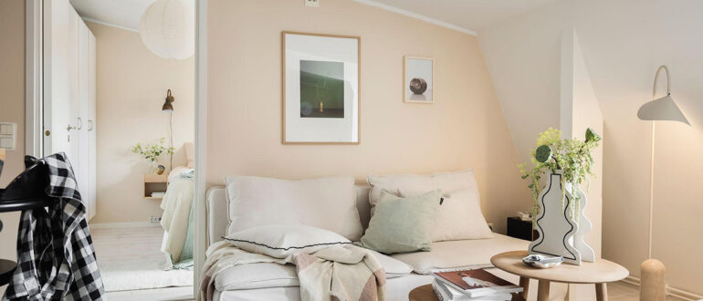 Этот шведский интерьер подкупает своей простотой и понятным уютом. Маленькие пространства со скошенными потолками не впечатлят искушенных зрителей, но лёгкая комбинация персиковых акцентов, деревянных деталей и скандинавской мебели