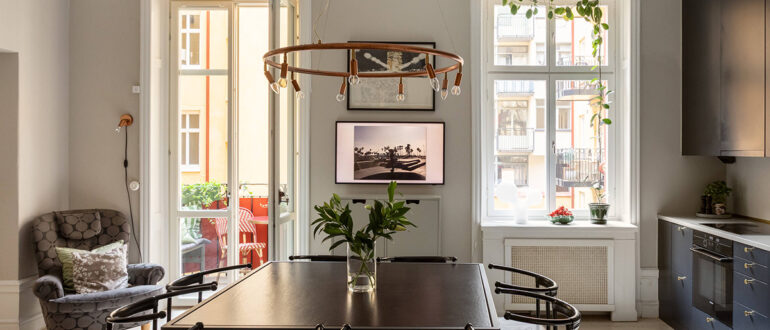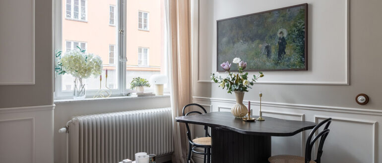 В желании сделать интерьер этой двухкомнатной квартиры в Стокгольме элегантным, дизайнеров не остановила даже его совсем маленькая площадь в 34 кв. м — молдинги украшают стены жилья, подчеркивая