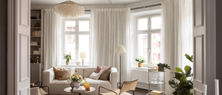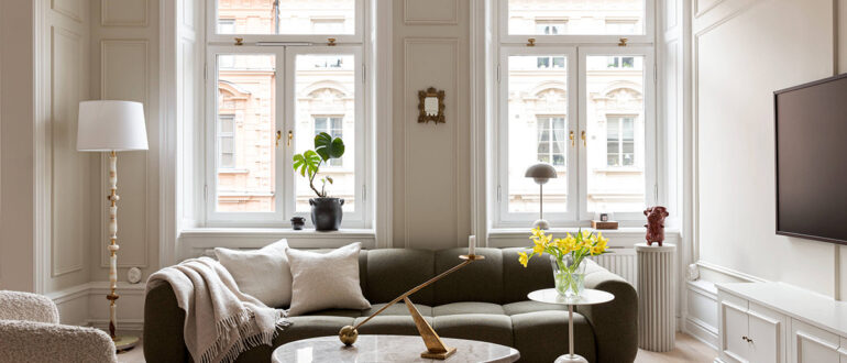 Эта квартира в старом доме в Стокгольме — угловая, поэтому пространство гостиной здесь довольно необычное с тремя большими окнами. Дизайнеры смогли также объединить комнату с кухней с помощью