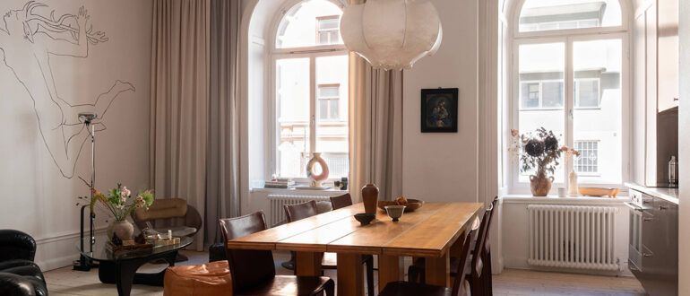 Роскошное пространство с высокими потолками и арочными окнами — эффектная, но не единственная фишка этой квартиры в Стокгольме. Интерьер наполнен лёгкими и интересными творческими нотками, которые выделяют его