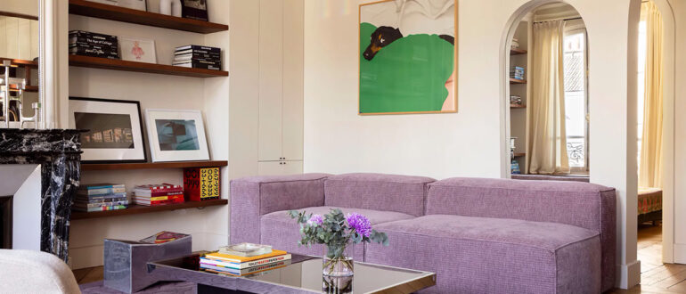 Светлый фон, красочные детали и немножко творчества — эта небольшая квартира в Париже оставляет очень приятное впечатление. Лиловый диван и ковёр такого де цвета в гостиной сразу настраивают